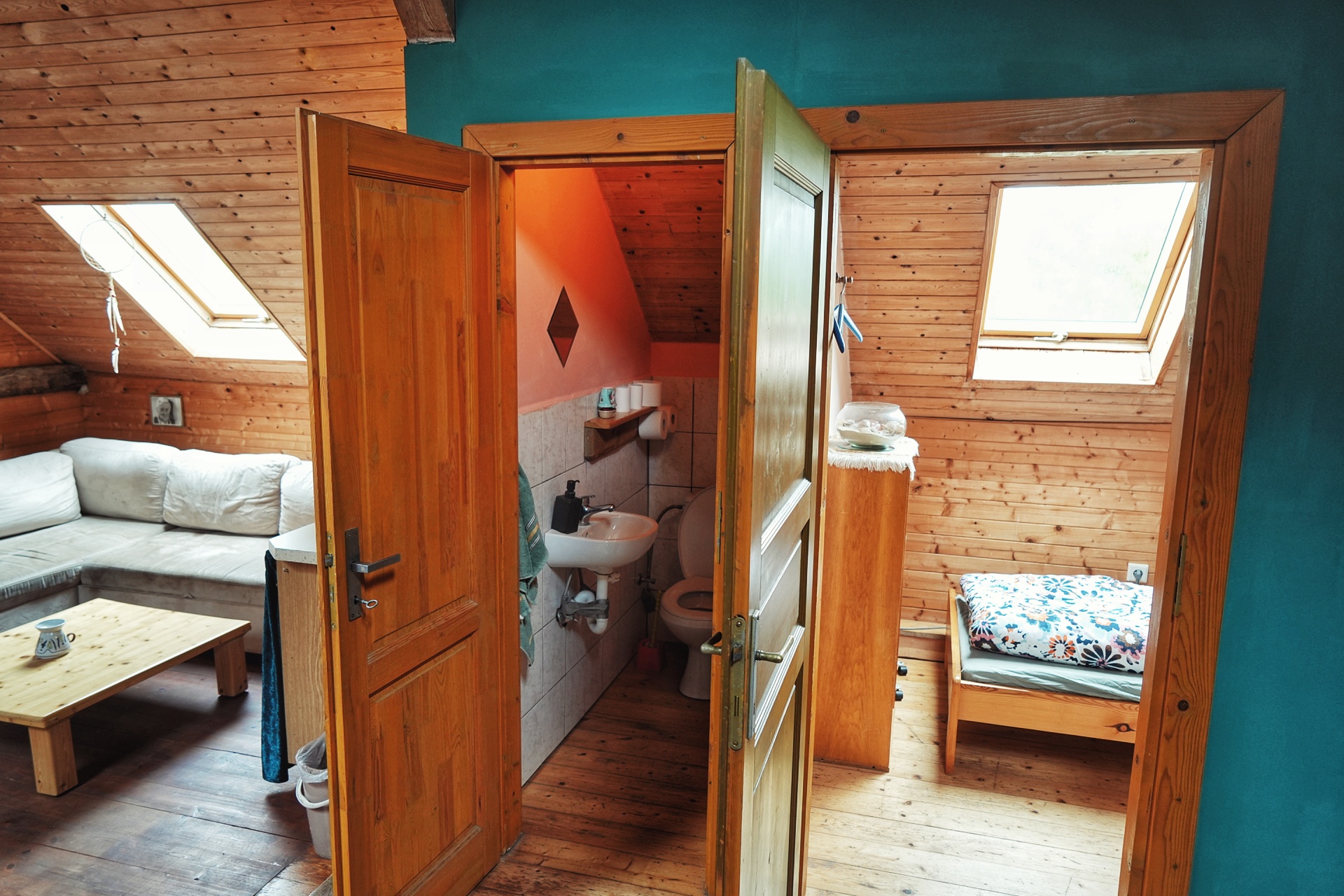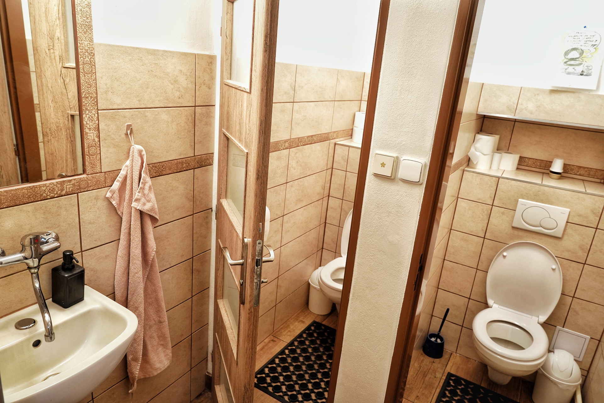 Toaleta a jednolůžkový pokoj vedle čajovny